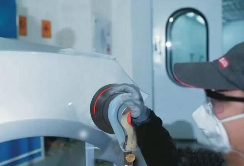 用手磨板P400~P500干磨砂纸或P800~P1000湿磨砂纸打磨中涂底漆的平整度。